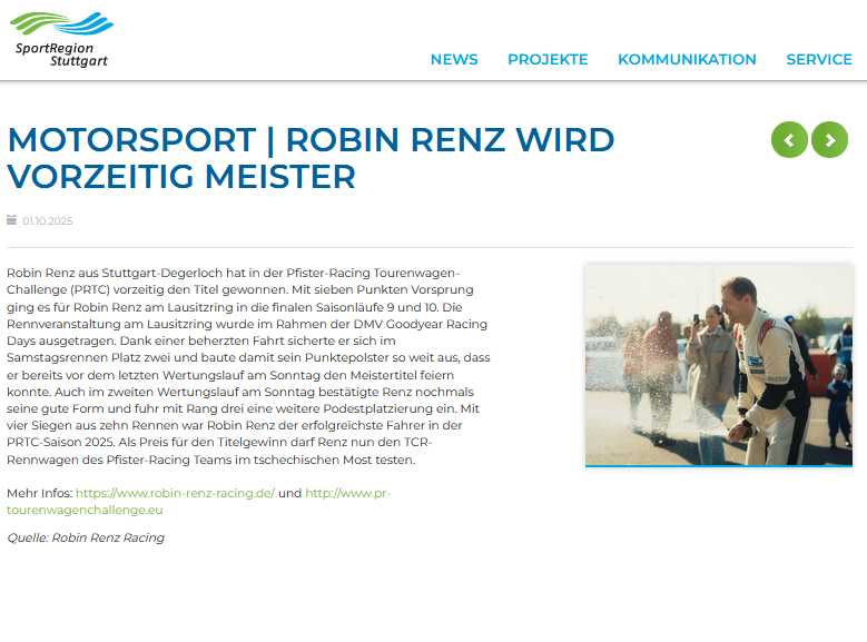 Robin Renz wird vorzeitig MeisterRobin Renz30. Sept. 20251 Min. LesezeitRobin Renz aus Stuttgart-Degerloch hat in der Pfister-Racing Tourenwagen-Challenge (PRTC) vorzeitig den Titel gewonnen.Zum Artikel auf sportregion-stuttgart.de